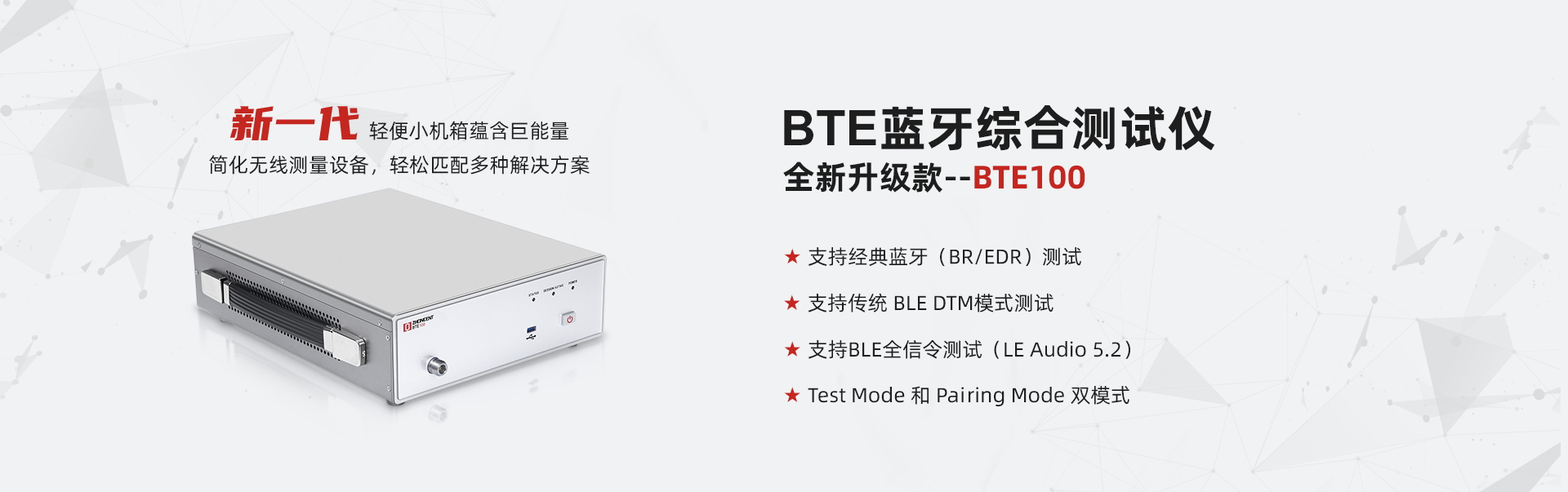 BTE100+是由中承科技獨(dú)立自主研發(fā)的新一代藍(lán)牙射頻協(xié)議綜測儀,支持藍(lán)牙設(shè)備配對信令模式下的功率、頻偏、調(diào)制、接收靈敏度、吞吐量等射頻指標(biāo)精準(zhǔn)測試,支持多種藍(lán)牙協(xié)議版本的深度解析及實(shí)時(shí)IQ數(shù)據(jù)捕獲。